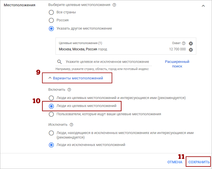 10. По умолчанию в Google Ads установлено Люди из целевых местоположений и интересующиеся ими. Это значит, что реклама будет показываться тем, кто находится в Москве и тем, кто находится, например, в Екатеринбурге, а ищет услуги в Москве. Этот параметр легко не заметить, отсюда и проблемы у локального бизнеса с показами.