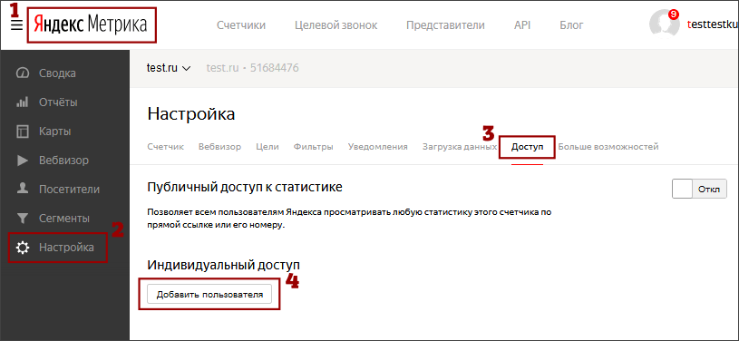 В Яндекс.Метрике есть возможность дать индивидуальный (гостевой) доступ или публичный доступ к счетчику (позволяет всем пользователям просматривать любую статистику по ссылке). Для проведения аудита или настройки контекстной рекламы предоставьте специалисту гостевой доступ к статистике вашего сайта.