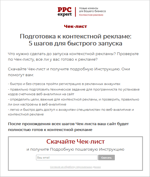 И в заключение. При продвижении сложных услуг чек-листами важно понимать, что человек, который скачал чек-лист, не намерен заказывать услугу прямо сейчас. Поэтому необходимо грамотно выстроить дальнейшую работу с таким пользователем: организовать продающую email-рассылку, или провести консультацию, где вы подробнее знакомите его со своей услугой.